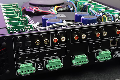 Les sorties pour les enceintes sont équipées de connecteurs Phoenix amovibles, idéaux pour les installations pré-câblées et sécurisées grâce à des dispositifs de fixation à vis.