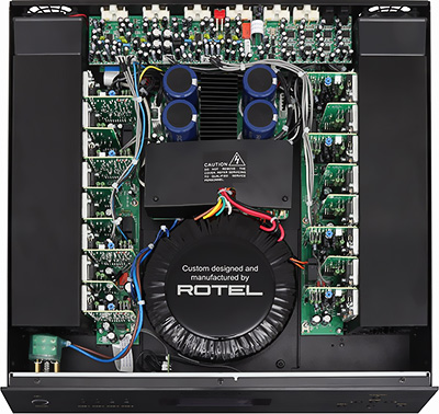Le transformateur toroïdal surdimensionné fabriqué en interne par Rotel alimente seize transistors de sortie haute capacité alimentés par un ensemble de condensateurs de filtrage grande capacité.