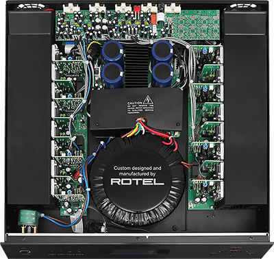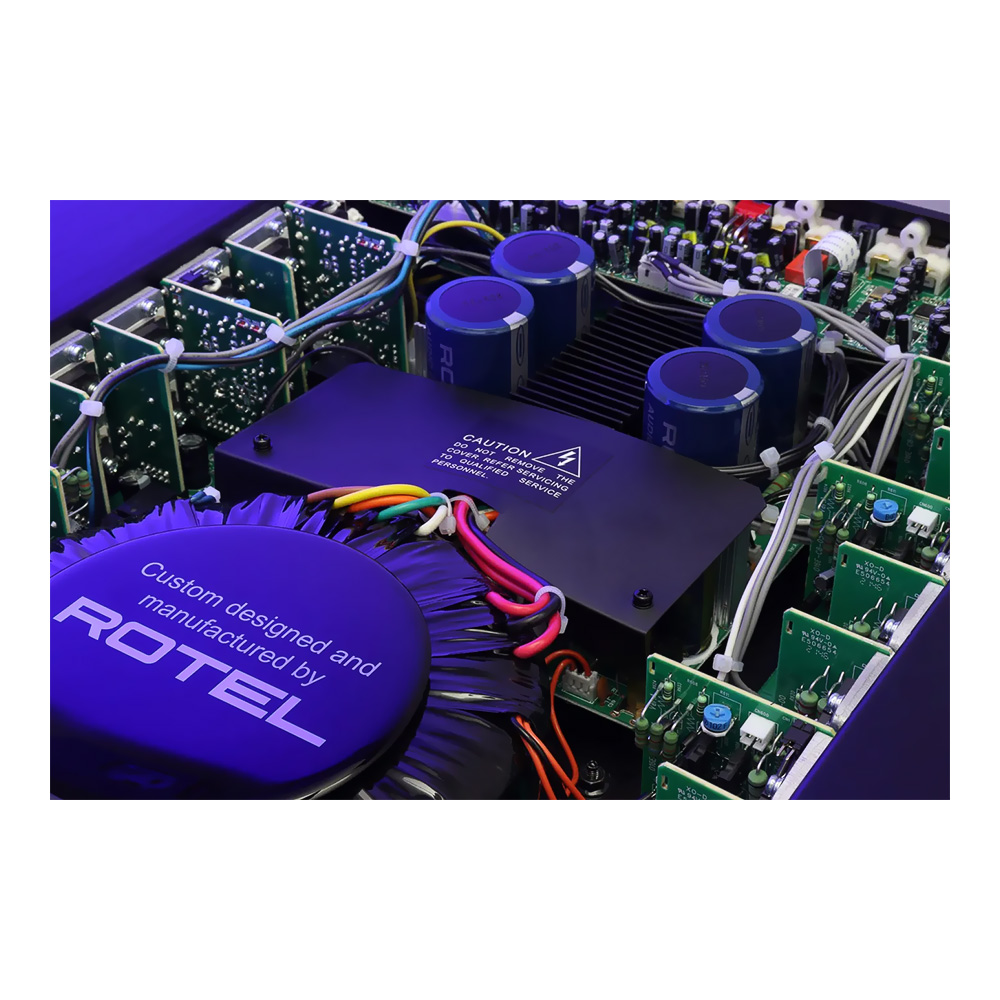 Le transformateur toroïdal surdimensionné, conçu et fabriqué par Rotel, fournit de l’énergie à seize transistors de sortie à haute capacité, lesquels sont alimentés par un ensemble de condensateurs de filtrage à large capacité.