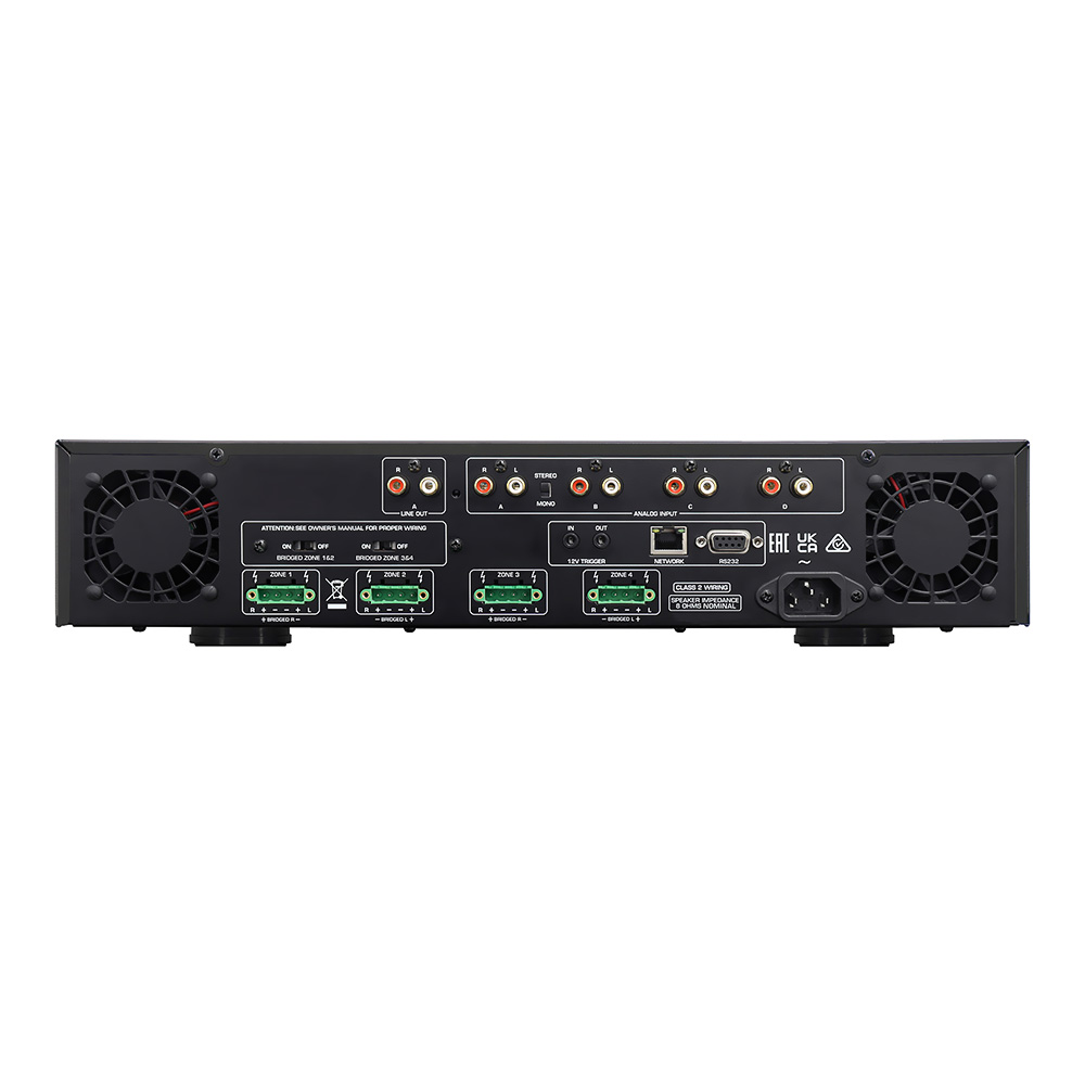 Le Rotel C8 comprend 4 entrées analogiques RCA disponibles pour toutes les zones via une commutation matricielle interne. L’intégration du système de contrôle peut se faire par le biais des interfaces IP et RS-232. Les sorties pour enceintes disposent de connecteurs Phoenix détachables adaptés aux installations précâblées. Il sont sécurisés par des mécanismes de verrouillage à vis. L’entrée de commutation 12 volts Trigger, quant à elle, assure un contrôle simplifié de l’alimentation.