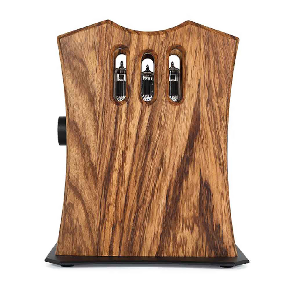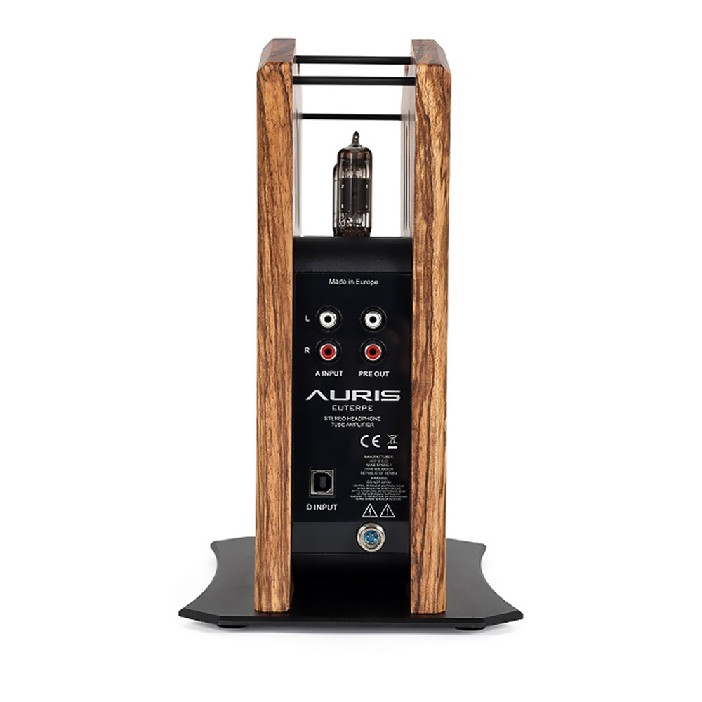 L’Euterpe se pose à la vertical, pour un gain de place mais aussi afin de servir support casque. Son design est élégant, Ses tubes sont alignés au centre en haut d’un boîtier en aluminium noir mat enserrée entre deux épaisses plaques de noyer massif le protégeant de chocs éventuels. Le tout reposant sur une plaque d’aluminium noire biseautée posée sur de petits pieds amortisseurs.