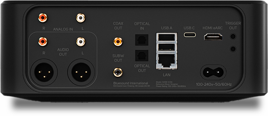 Les sorties analogiques du Bluesound NODE ICON incluent RCA stéréo et XLR stéréo équilibrées, permettant une transmission de signal analogique de haute qualité, idéale pour des systèmes Hi-Fi exigeants.