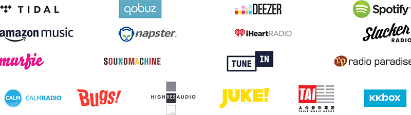 WiMP, Rdio, Slacker Radio, Qobuz, HighResAudio, JUKE, Deezer, Murfie, HDTracks, Spotify, TIDAL, Napster, Rhapsody, Apple Music