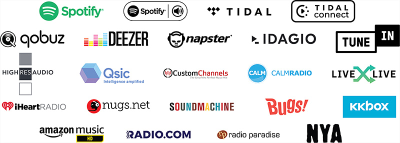 Spotify Amazon Music HD, TIDAL, Deezer , Qobuz, HighResAudio ( VAULT Requis), Napster, KKBox, Bugs, Taihe Music ZONE, SoundMachine, IDAGIO, OraStream