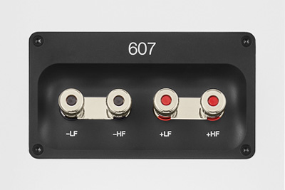 Les bornes de connexion des Bowers & Wilkins 607 S3 offrent une grande flexibilité et fiabilité. Faites de matériaux de qualité, elles supportent divers types de câbles et permettent des options comme le bi-câblage.