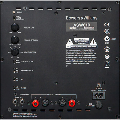 Le Bowers & Wilkins ASW610 inclut une entrée ligne RCA stéréo, des entrées haut-parleur, et une entrée trigger 12V (jack 3.5 mm).