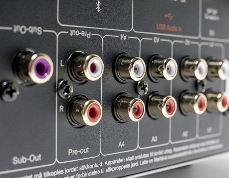 En plus des connexions obligatoires pour les systèmes d’enceintes sous forme de bornes à vis solides, qui permettent une configuration A + B, une sortie préampli et une sortie subwoofer séparée sont disponibles. Un casque peut également être connecté, et le connecteur mini-jack stéréo 3,5 mm correspondant est situé directement sur le panneau avant.