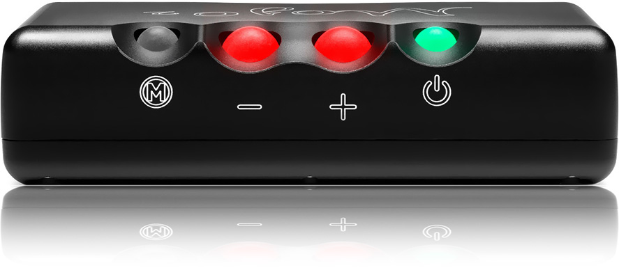 Les fonctions proposées par le nouveau UHD DSP ont nécessité l’apparition d’un quatrième bouton prenant place à côté de ceux dédiés à l’alimentation et au volume. Ainsi, le Chord Mojo 2 intègre non plus un trio, mais un quatuor de petites sphères lumineuses permettant son contrôle. Chaque pression sur ces boutons affiche des couleurs variées qui représentent différentes fonctionnalités.