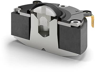Le système magnétique des hauts-parleurs de la Dali OPTICON 6 MK2 est constitué d’un grand aimant annulaire en ferrite entourant une pièce polaire composée du matériau breveté DALI SMC. La pièce polaire et l’aimant en ferrite sont fixés à l’avant et l’arrière entre des plaques en fer doux afin de créer le champ magnétique approprié au bon fonctionnement de la bobine mobile.