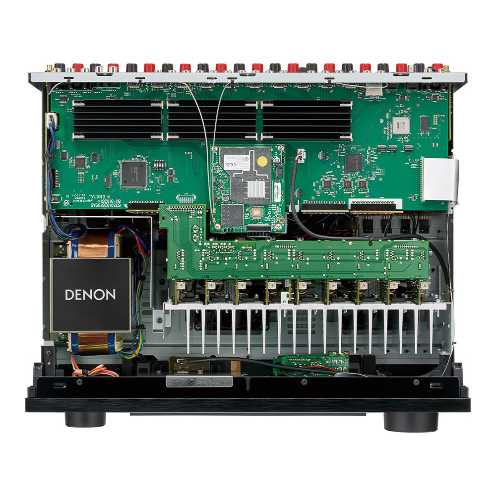 Le prix du Denon AVC-X4800H est justifié par un circuit d’amplification haut de gamme basé sur une conception d’amplificateurs monophoniques qui garantit une plus grande stabilité de l’équilibre général. Sa puissance est supérieure de 20 % avec un taux de distorsion inférieur à l’AVC-X3800H, ce qui améliore la reproduction des détails et l’immersion, en particulier à faible volume.