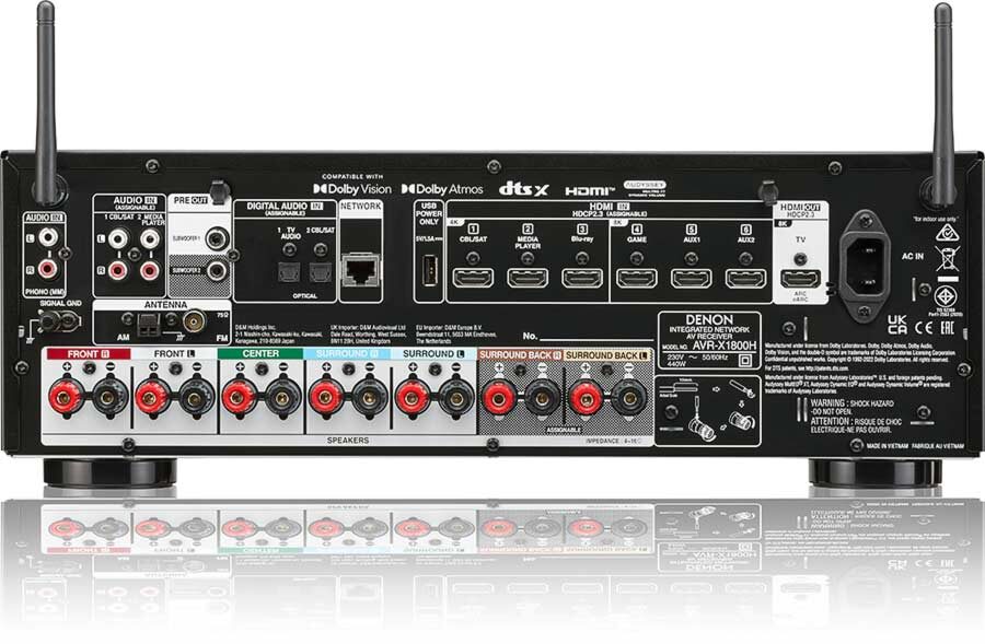 Le Denon AVR-X1800H DAB est doté de 6 entrées HDMI 2.1 CEC, dont 3 sont compatibles 4K/120 et 3 autres 8K/60, toutes certifiées HDCP 2.3. Ces entrées supportent le Deep Color, le xvYCC et le signal 3D. Pour les amateurs de vinyle, une entrée PHONO MM est présente. Deux entrées numériques optiques sont aussi présentes.