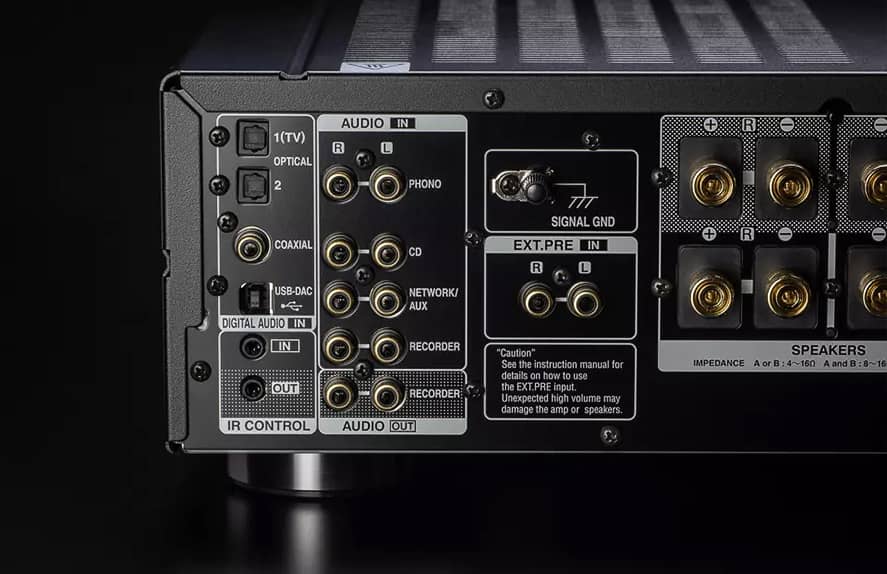 Le Denon PMA-1700NE dispose de connexions numériques et analogiques. Il arbore une entrée coaxiale et USB, deux entrées optiques et quatre entrées RCA analogiques. Les ports d’entrée et de sortie IR vous permettent de contrôler la direction de l’unité plutôt que d’utiliser le récepteur IR à l’avant.