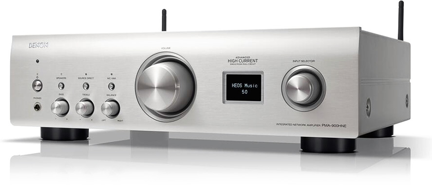L’amplificateur intégré Denon PMA-900HNE délivre une puissance de sortie de 2×50 watts sous 8 ohms et de 2×85 watts sous 4 ohms. Cet ampli dispose d’une mise en réseau permettant le streaming des radios web, l’écoute de vos fichiers musicaux locaux ou en cloud via les opérateurs tel Tidal, Deezer, Spotify… Il s’appuie sur l’application gratuite Heos pour tablette ou Smartphone. Il permet le multi-room avec les appareils compatibles (Heos). Il est également Bluetooth et AirPlay 2.