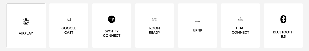 Airplay 2, Google Cast, Spotify Connect, Tidal Connect, UPnP, ROON READY et multiroom