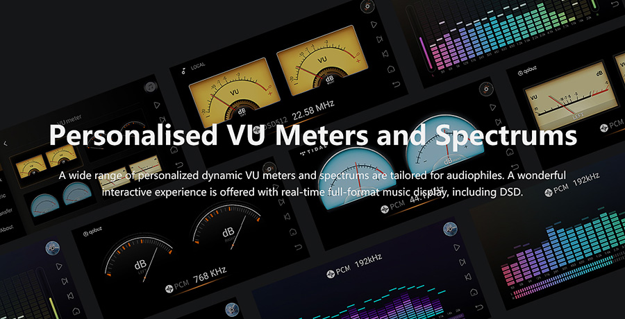 Ces VU-mètres dynamiques et affichages spectraux sont conçus pour refléter la gamme complète des dynamiques et des nuances trouvées dans les formats haute résolution, y compris le DSD.