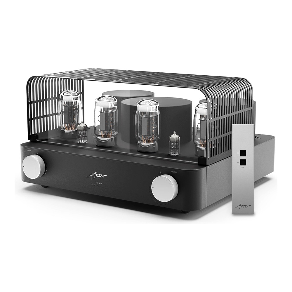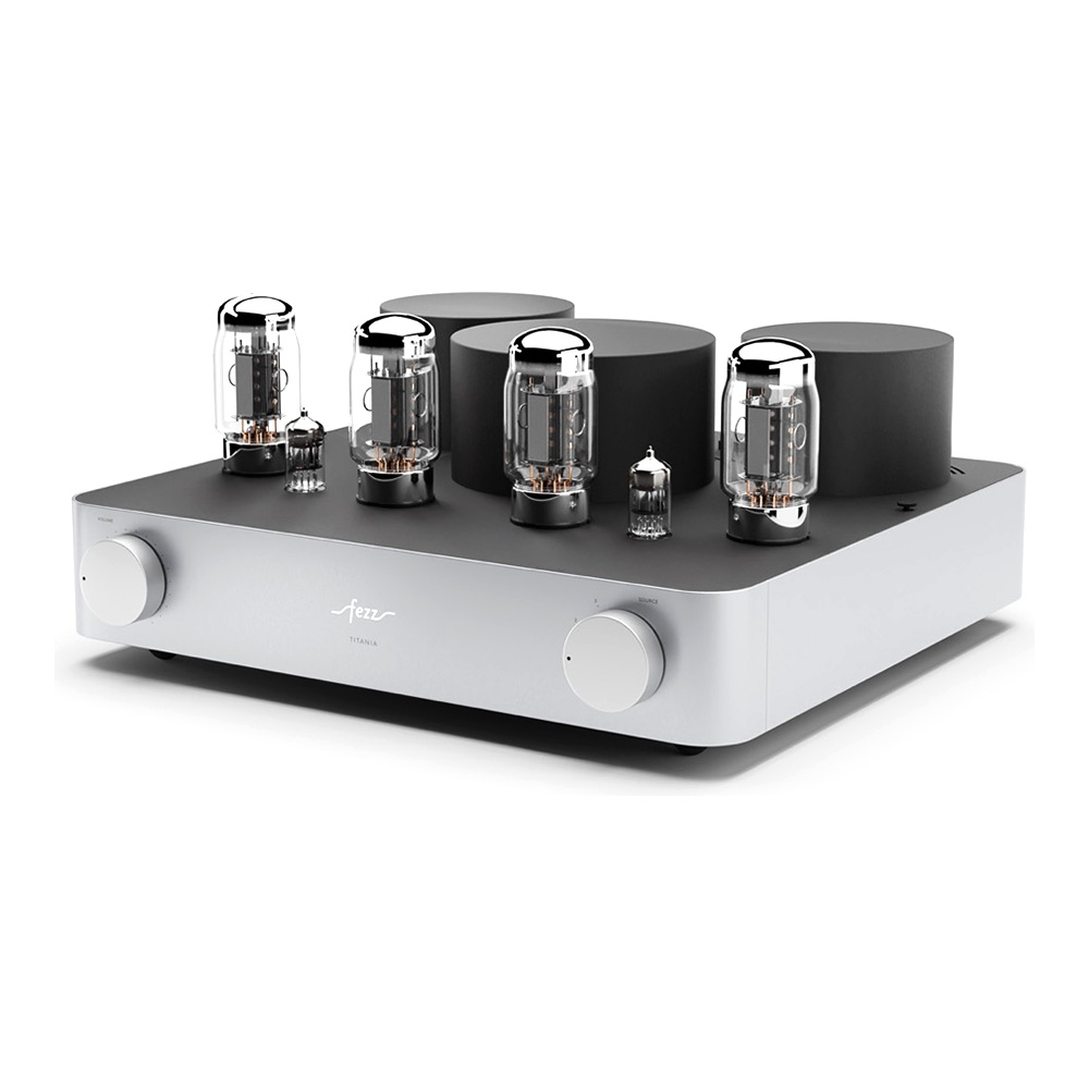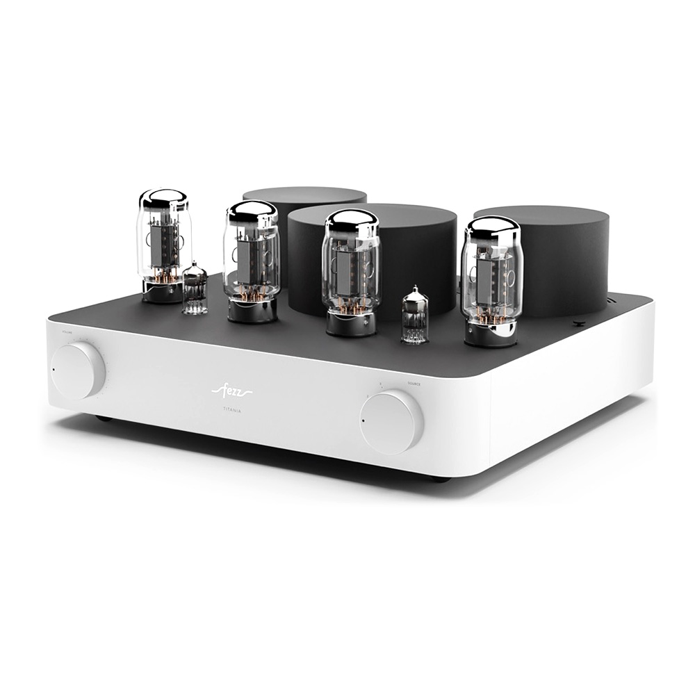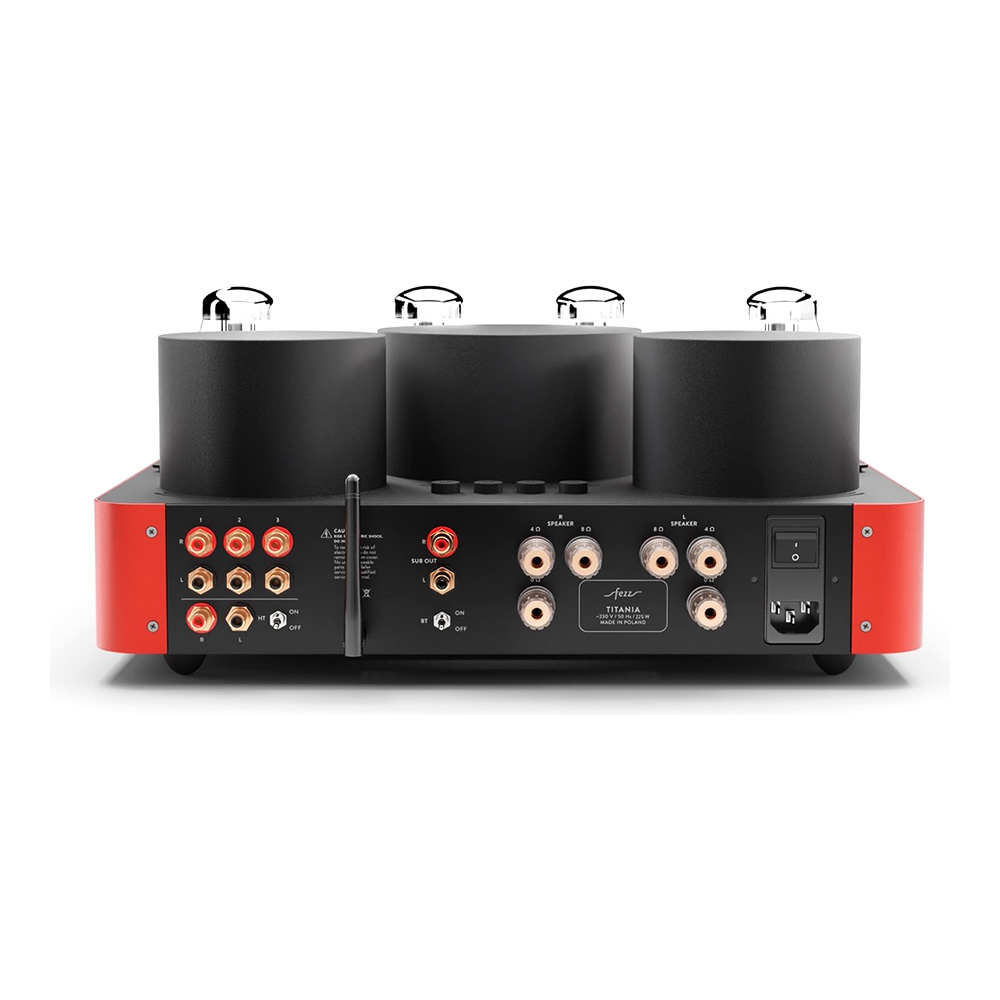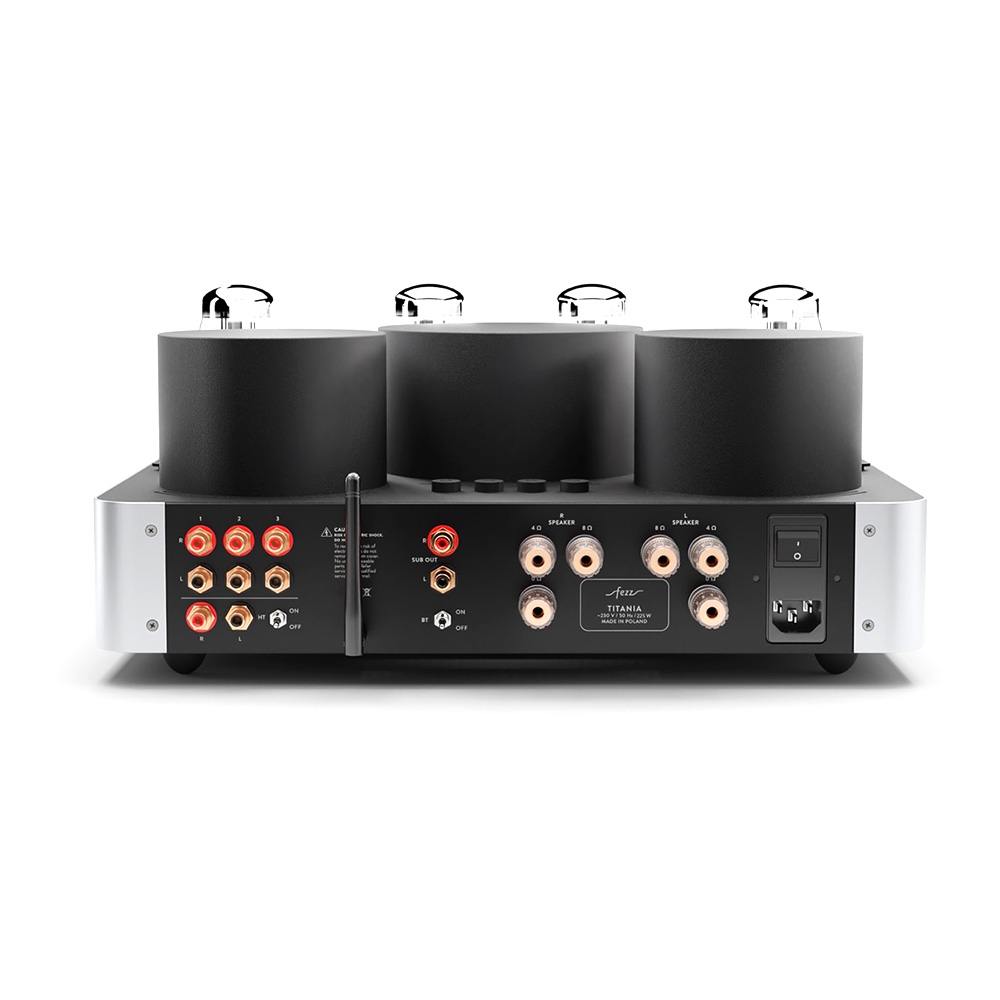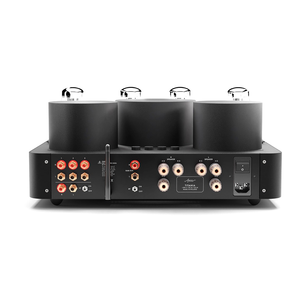 Équipé de quatre tubes KT881Les KT88 sont des tubes de puissance à vide, réputés pour leur capacité à offrir un son riche, chaleureux et détaillé. Avec une puissance de sortie élevée et une faible distorsion, ils sont prisés pour les amplificateurs haute fidélité et apportent une dynamique sonore remarquable, particulièrement dans les configurations push-pull.et deux tubes ECC832Réputés pour leur capacité à amplifier avec finesse les signaux faibles, les tubes ECC83 (également appelés 12AX7) sont des composants de préamplification de haute précision. Ils apportent une chaleur harmonique naturelle et un niveau de détail saisissant. Leur présence garantit une restitution sonore riche, dynamique et nuancée, idéale pour révéler les moindres subtilités d’un enregistrement., l’ampli intégré Fezz Titania EVO repose sur un circuit push-pull en classe AB13La classe AB1 est une variante de la classe AB, principalement utilisée dans les amplificateurs à tubes. Elle se distingue par une caractéristique essentielle : les grilles des tubes de sortie n’absorbent pas de courant pendant le fonctionnement. Cela permet une meilleure linéarité sonore et réduit les distorsions, au prix d’une puissance de sortie légèrement inférieure. Comparée à la classe AB classique, la classe AB1 privilégie donc la précision sonore à l’efficacité maximale., offrant une puissance de 2 x 45 W. Les transformateurs toriques, conçus par Toroidy.pl avec la technologie AGTC, optimisent la bande passante et réduisent les pertes énergétiques.