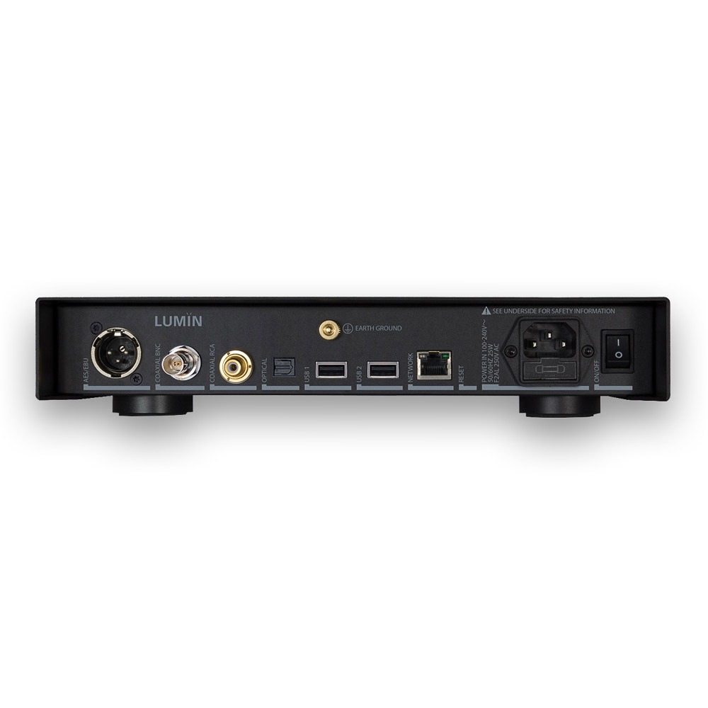Le Lumin U1 Mini vous offre cinq sorties numériques différentes, y compris la nouvelle sortie numérique USB. Les fichiers audio DSD jusqu’à 256 11,2 MHz 1 bit et PCM 44,1 – 384 kHz 16-32 bits sont pris en charge. En interne, il existe quatre oscillateurs d’horloge à cristal avec un bruit de phase extrêmement faible. L’U1 prend en charge DoP (DSD over PCM) via les sorties optiques, coaxiales (RCA et BNC) et AES / EBU. Une connexion réseau Gigabit et une connexion à la terre sont également disponibles. Le boîtier en aluminium luxueux, découpé avec précision dispose d’un écran clair et facile à lire améliore l’expérience de streaming .