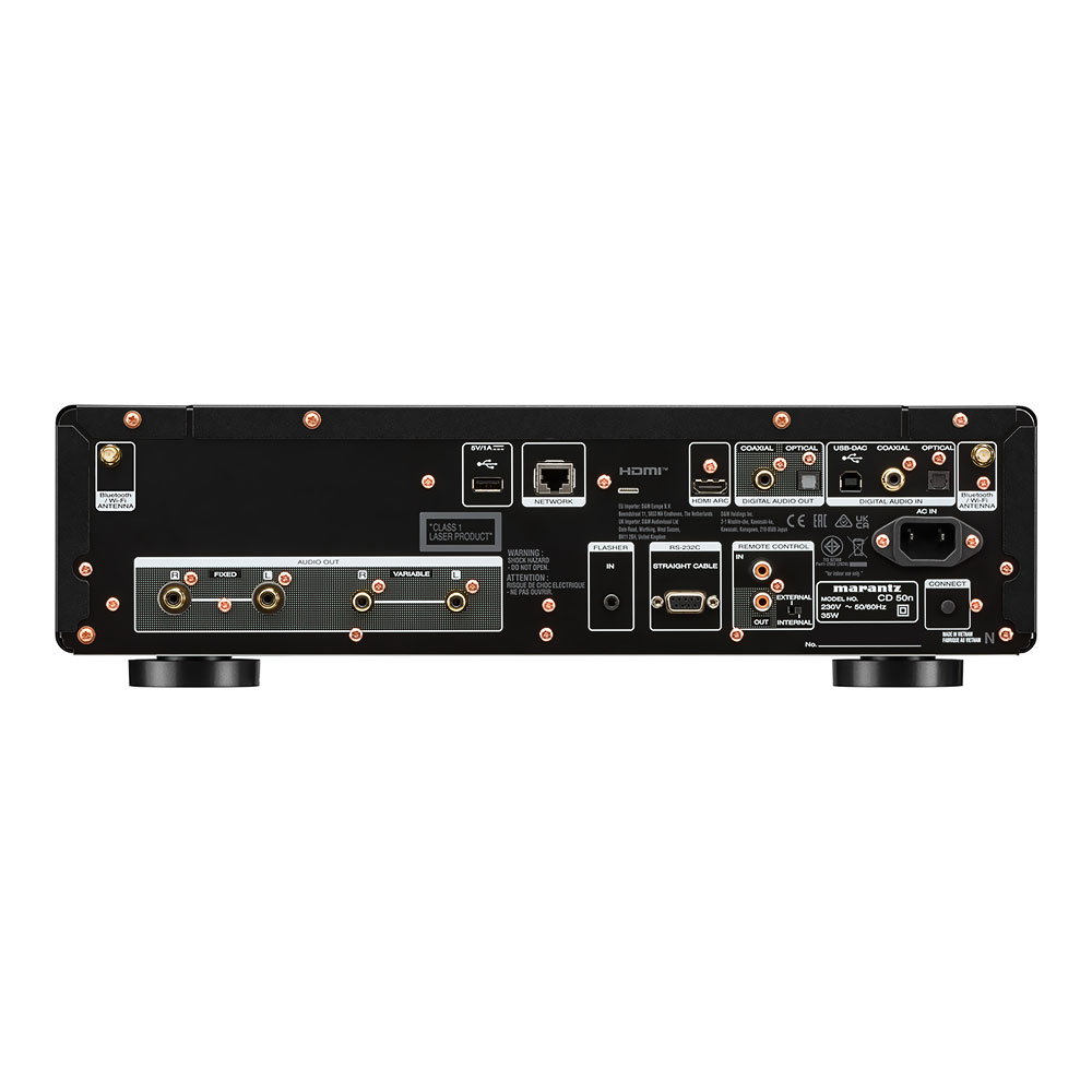 Côté sorties, le CD50N offre une sortie optique et une sortie coaxiale pour une flexibilité maximale. Les sorties RCA fixes et variables sont conçues pour s’intégrer facilement à votre système existant, tandis que la sortie casque en façade est parfaite pour une écoute privée.