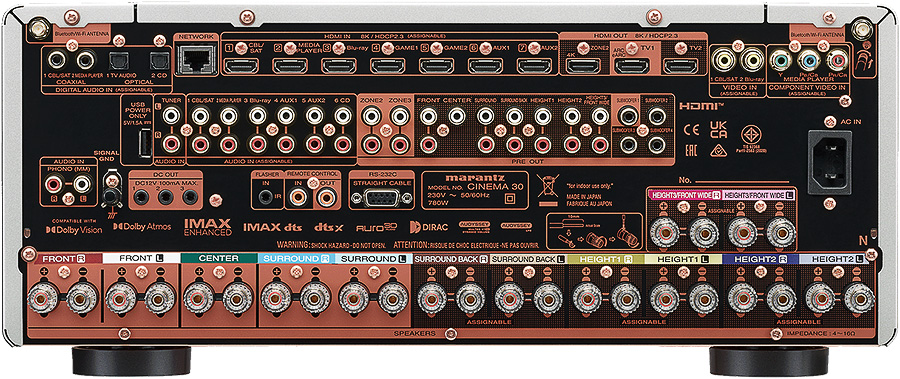 Outre les sept entrées HDMI 2.1 pour la vidéo UHD 8K et 4K, le Marantz Cinema 30 offre trois sorties HDMI, dont une avec support eARC, permettant une transmission audio avancée du téléviseur vers l’amplificateur.