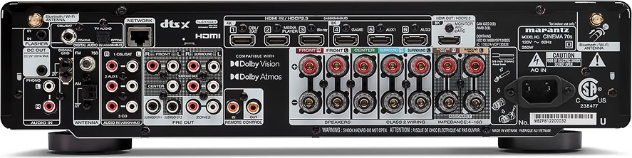 Le Marantz Cinema 70s est équipé d’une connectique complète, il intègre 6 entrées HDMI, dont 3 compatibles 2.1 pour la transmission de signaux HDR 4K/8K. Par ailleurs, il est doté de 4 entrées analogiques RCA, dont une entrée phono. Les deux entrées numériques incluent une entrée optique et une entrée coaxiale.