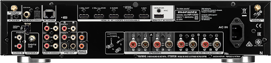 En plus des ces entrées HDMI, l’ampli Marantz NR1200 possède 4 entrées RCA, une entrée phono mm pour votre platine vinyle. Coté connection numérique, il propose deux entrées numériques optique et coaxiale, Une sortie pré-out zone2 permet le raccord à un ampli de puissance et alimenter une seconde pièce. L’ajout de un voir deux subwoofer est prévu via ses deux sorties préamplifiées.