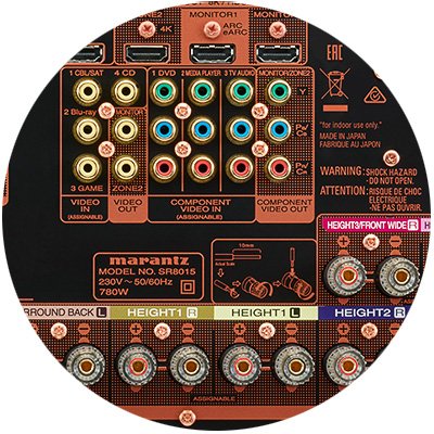 Grâce à la prise en charge du canal large avant, vous pouvez ajouter deux haut-parleurs larges avant avec Dolby et DTS pour créer une scène surround avant plus homogène jusqu’aux configurations de haut-parleurs 9.1.2 ou 9.1.4. Pour une configuration 9.1.4, il faut des amplifications supplémentaires à 2 canaux connectées au Marantz SR-8015.