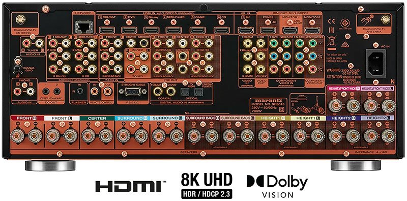 L’amplificateur home-cinéma Marantz SR-8015 est un modèle 11.2 canaux capable de délivrer jusqu’à 140 watts de puissance, successeur du bien connu SR-8012 dont il se distingue par une prise en charge des flux UHD 8K HDR, ce qui en fait le compagnon indispensable d’une TV UHD 8K.