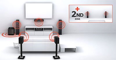 profitez d’un son surround natif dans la pièce principale tout en diffusant la même source après mixage en 2 canaux dans la deuxième zone