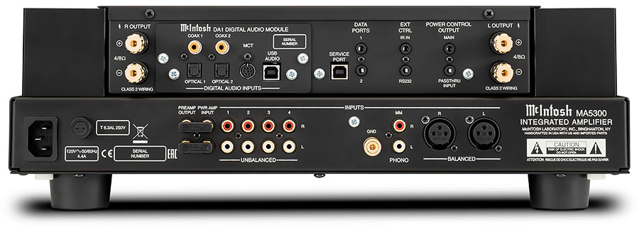Le McIntosh MA5300 intègre également un convertisseur numérique-analogique (DAC) de haute précision logé dans le module audio numérique DA1, capable de traiter les signaux numériques jusqu’à 32 bits, ainsi que le DSD (jusqu’à DSD256) et DXD 384kHz.