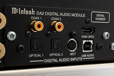 En plus des entrées phono citées précédemment, le McIntosh MA8950 est doté d’une entrée équilibrée et de six entrées asymétriques pour connecter diverses sources analogiques. Il intègre également le module numérique DA2, qui comprend deux entrées coaxiales, deux entrées optiques, une entrée USB et une entrée MCT.