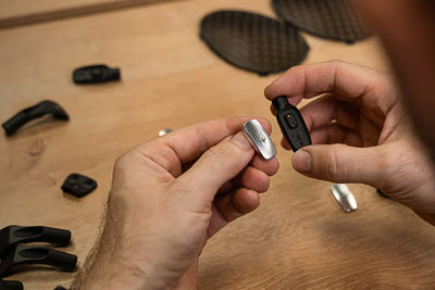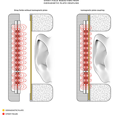 Grâce aux plaques ferromagnétiques brevetées, le champ démagnétisant est redirigé vers le transducteur, améliorant ainsi son efficacité de 12% et réduisant de 95% les champs magnétiques indésirables près de la tête de l’utilisateur.