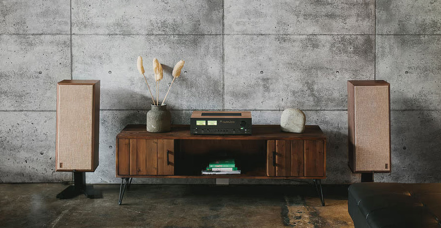 Avec un revêtement en vinyle fini noyer, un panneau avant gris foncé et le logo original de New Acoustic Dimension dans sa police de caractères cursive des années 1970, il évoque la nostalgie des designs classiques.