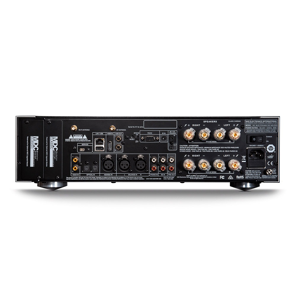 Ce NAD M33 comprend six entrées numériques et de trois entrées analogiques, y compris une pour phono MM. Le panneau arrière accueille deux sorties d’enceintes autorisant le bi-wiring et 2 sorties subwoofer couplées à un filtre numérique entièrement configurable.