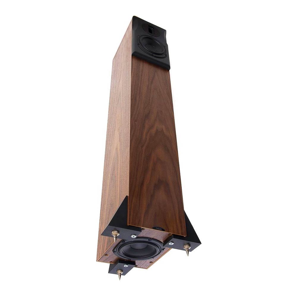 La partie supérieure indépendante de la colonne est fermée par un volume clos, elle est séparée par deux espaces dédiés, un pour le tweeter, l’autre pour le médium. Un élément profilé s’associe au caisson par une membrane polyéthylène de découpage afin de réduire au maximum les vibrations de la caisse sur le tweeter et la membrane du médium. Les ingénieurs de Neat ont choisi pour le haut du spectre un tweeter à ruban de 50mm. Pour le medium, il s’agit d’une membrane en papier déjà utilisée dans les gammes Motive et Iota Alpha.
