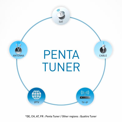 Outre le satellite, le câble et l’antenne, le tuner Penta est compatible avec deux autres types de signaux. Grâce à la réception par internet (IPTV) et par réseau domestique (TV>IP), le positionnement de votre téléviseur n’est plus dépendant de l’emplacement de la prise d’antenne.