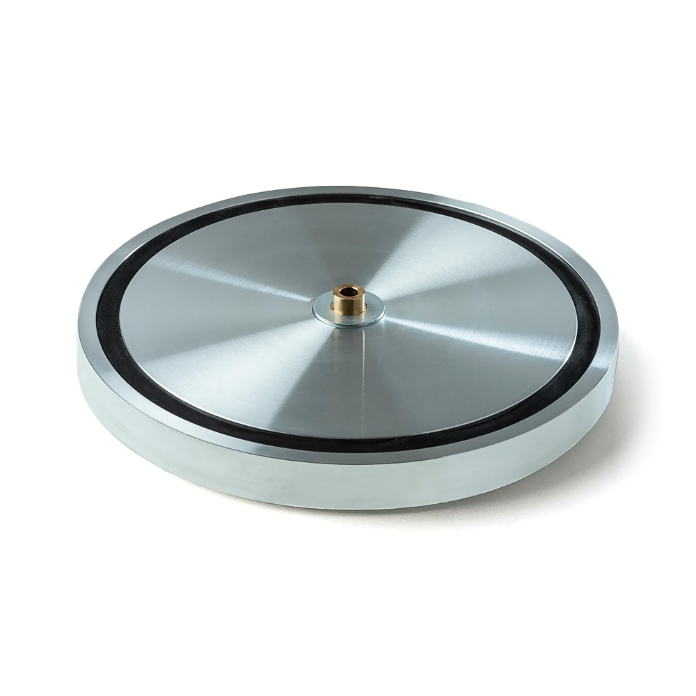 Le châssis est construit à partir d’une épaisse pièce de MDF1Medium Density Fiberboard. Quant au plateau, pesant 5,1 kg et amorti en TPE2Élastomère thermoplastique., il est usiné avec précision et équilibré à partir d’un seul bloc d’aluminium. De plus, un support magnétique avec aimant en néodyme soutient le plateau afin de minimiser les frottements.