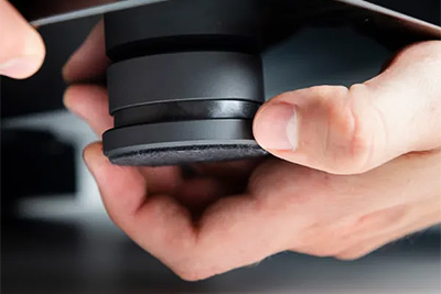 La Pro-Ject X8 est équipée de pieds en aluminium ajustables en hauteur, usinés avec précision. Grâce à la technologie d’amortissement TPE intégrée dans les pieds, la platine est efficacement isolée de la surface sur laquelle elle repose. Cette caractéristique assure un soutien optimal et diminue considérablement les chances de résonance acoustique.