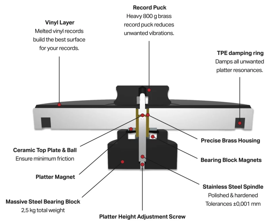 Ces pieds magnétiques isolent remarquablement le châssis principal de la platine de son environnement, créant réellement un effet de flottement pour une combinaison unique de conception de « charge en masse » et de « platine flottante ».