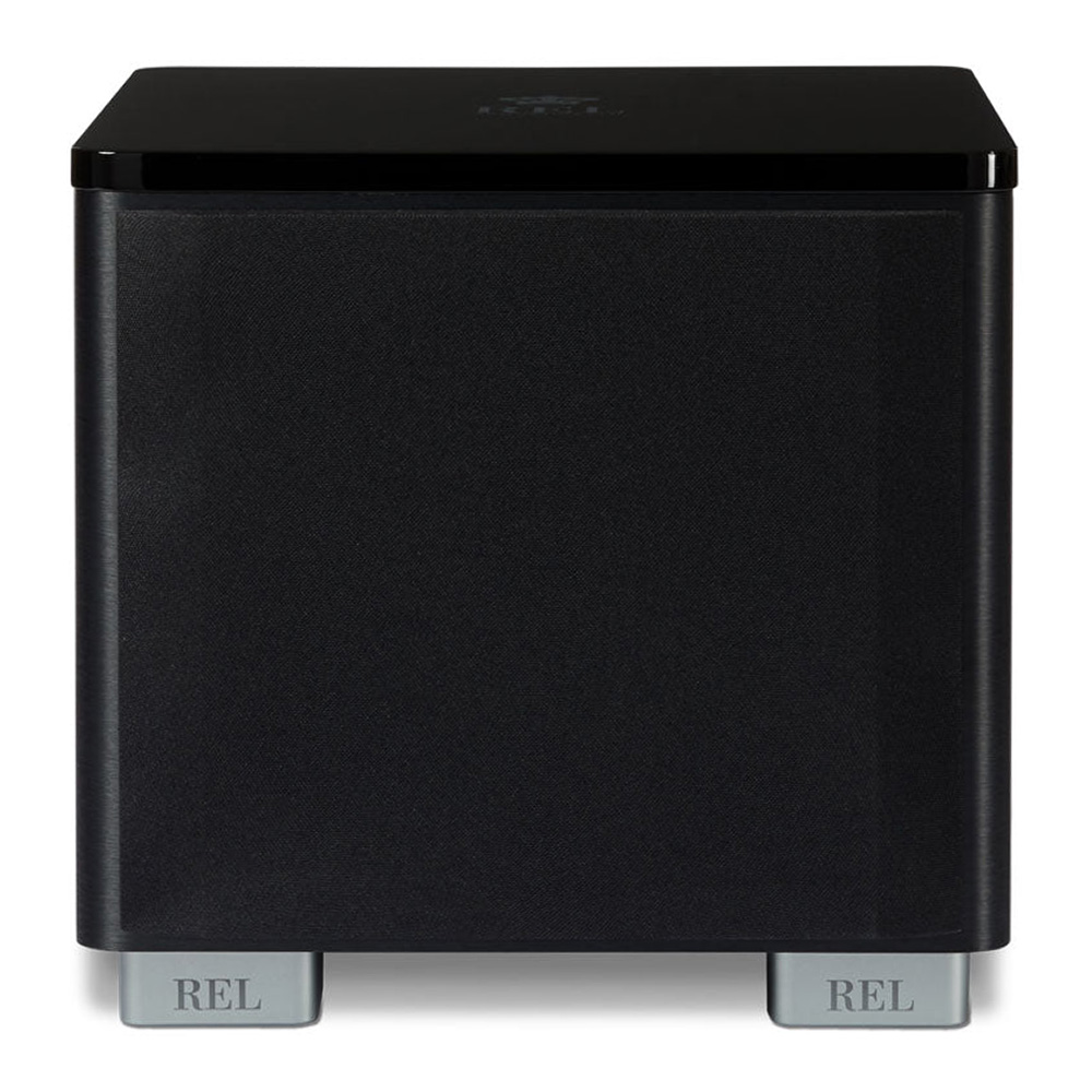 Le regard est naturellement attiré par le panneau supérieur, qui arbore une finition en laque noire piano polie à la main. Un logo REL discret flotte dans la couche supérieure de laque, tandis que le corps du caisson est revêtu d’un composite à rayures horizontales et à grain linéaire.