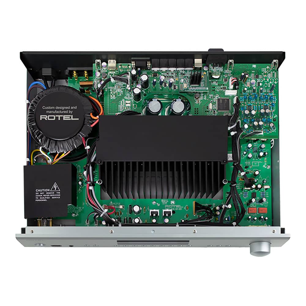 Le Rotel A12MKII est doté d’un transformateur toroïdal surdimensionné fabriqué par Rotel qui alimente des condensateurs de stockage et de lissage haute efficacité pour un rendu profond et contrôle de la puissance des basses. La source d’alimentation comprend de multiples régulateurs de tension et de courant qui alimentent indépendamment les circuits analogiques, numériques et d’amplification critiques en isolant les signaux basse tension sensibles des sorties haut-parleurs haute puissance afin d’atténuer le bruit de fond et de réduire toute distorsion indésirable. La conception des circuits suit le principe de conception équilibrée (Balanced Design Concept) exclusif de Rotel avec des techniques d’isolation physiques et électriques pour un son cristallin.