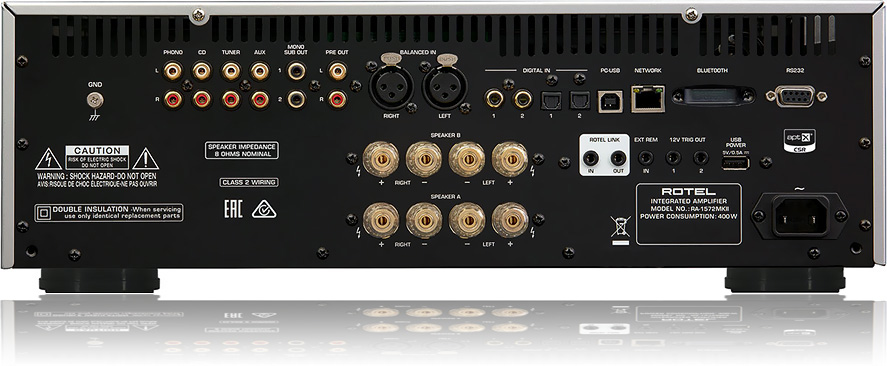 Ce Rotel RA-1572MKII prend en charge les sources numériques au travers d’un convertisseur Texas Instruments 32 bits / 384 kHz dont les circuits de filtrage et de sortie sont optimisés pour restituer les plus fins détails. Les circuits du préamplificateur et les étages d’amplification linéaire bénéficient d’une conception personnalisée pour garantir détails et vivacité ainsi qu’une scène sonore immersive. Les entrées analogiques, numériques, PC-USB compatibles MQA, streaming sans fil Bluetooth aptX ™ et AAC, XLR symétriques et phono pour cellule à aimant mobile, assurent les connexions de toutes vos sources.