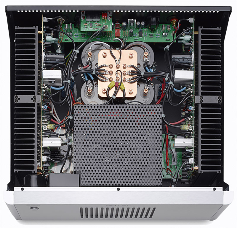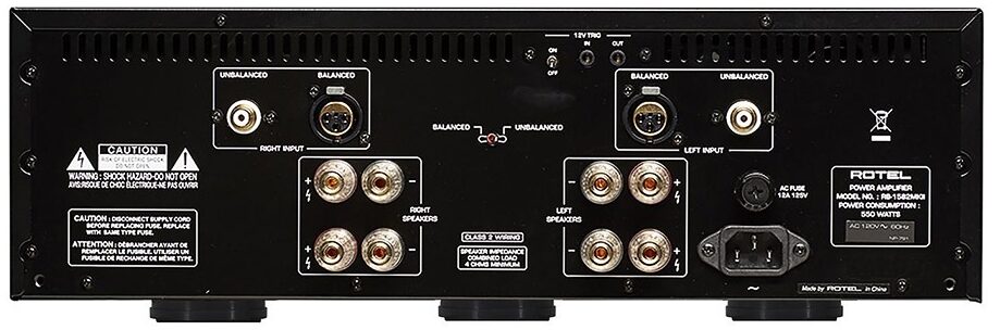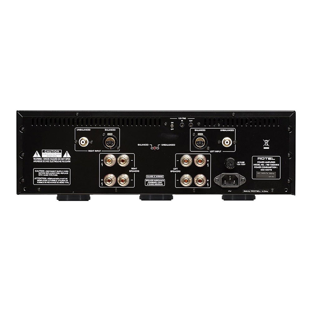 Le très haut niveau de performances du Rotel RB-1582 MKII débute avec son transformateur toroïdal surdimensionné, associé à une capacité de stockage record de 60000 µF au niveau de ses condensateurs spécifiques » slit foil « , ce qui lui permet de délivrer une puissance parfaitement stable sur ses étages de sorties. Les condensateurs slit foil ont la capacité de se charger et de se décharger extrêmement rapidement, ce qui garantit l’intégrité du signal pendant les crescendos d’orchestre ou les coups répétitifs de grosse caisse, par exemple. Le design de fabrication des canaux gauche et droit est de conception bloc mono au-delà du transformateur toroïdal, et toutes les masses convergent en étoile sur une plaque de masse en cuivre permettant d’optimiser le rapport signal/bruit. Les étages de sortie sont de types discrets et ils sont constitués de 10 transistors bipolaires à forts niveaux en courant pour chaque canal. Les entrées sont au choix de type XLR symétriques ou asymétriques sur RCA.