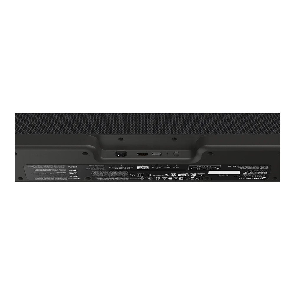 La connectique de la Sennheiser Ambeo Soundbar Mini intègre un port HDMI 2.1 eARC assurant une transmission audio en haute résolution sans compression, compatible avec Dolby TrueHD et DTS-HD Master Audio.