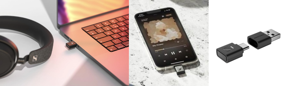 Un dongle USB est fourni avec le casque, il permet la transmission audio en aptX Lossless et aptX adaptive, pour une reproduction sans fil jusqu’en 24bits / 96 kHZ y compris pour les appareils qui ne prennet pas en charge ces formats nativement. La réduction de la latence audio à 30 millisecondes pour le gamming. Il assure une compatibilité Auracast et améliore les appel téléphonique, la transmission vocale est plus claire et stable, pratique pour les appels ou les visioconférences…
