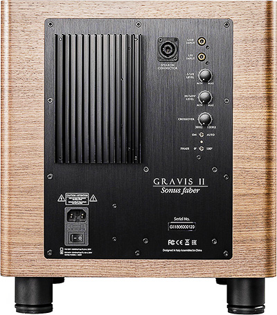 Le panneau arrière du Sonus Faber Gravis II offre une connectivité complète. Il est doté d’une entrée RCA mono bas niveau, une entrée RCA mono LFE et une entrée stéréo haut niveau au format Speakon.