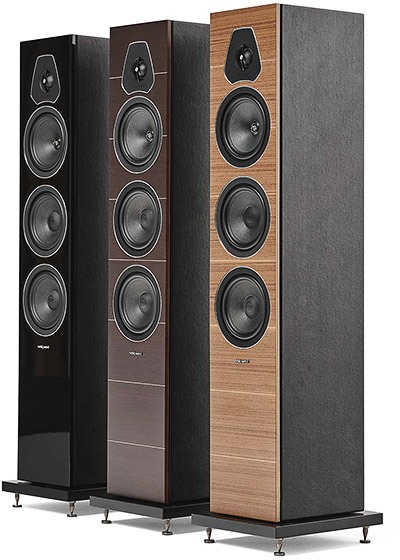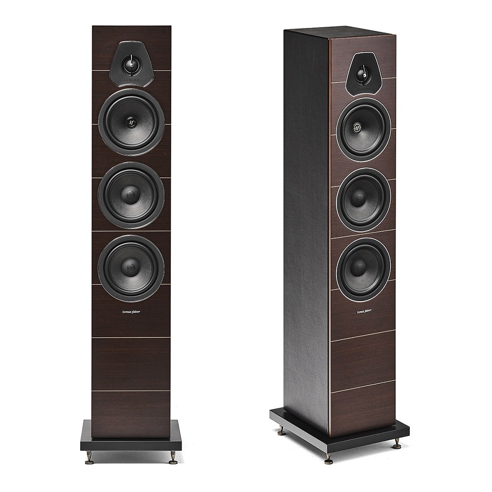 Les matériaux utilisés pour cette ligne comprennent du bois multicouche pour le déflecteur avant et un placage de bois véritable de Lumina. Les finitions disponibles incluent le noyer et le wengé, toutes deux avec des incrustations en érable, ainsi qu’une troisième option en noir piano. Le caisson est recouvert à la main du cuir noir emblématique Sonus Faber sur toutes les autres surfaces.
