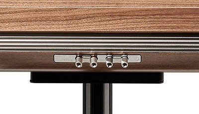 Pas moins de huit couches de bois ont été utilisées pour fabriquer le boîtier du haut-parleur. Ainsi que divers renforts internes et éléments en aluminium pour plus de rigidité et de contrôle. La plaque de base avec les pointes est également en aluminium pur. À l’arrière du Sonus faber Olympica Nova CII se trouvent les connexions de câbles d’enceintes bifilaires.