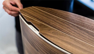 Les murs sont faits de huit couches de bois courbé, ainsi, cela confère à l’armoire une rigidité extrême. À l’intérieur de l’armoire, des nervures structurelles soigneusement placées sont utilisées comme renforcement pour réduire les vibrations et gérer la puissance globale du mouvement des transducteurs.