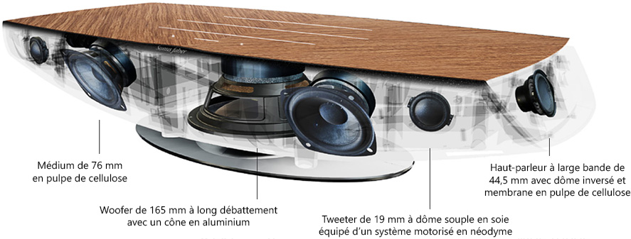 Sous le tweeter se trouve un woofer de 165 mm avec un cône en aluminium, deux haut-parleurs médium de 76 mm avec des cônes en fibre de papier, deux haut-parleurs de 44,5 mm avec des cônes en cellulose et deux tweeters de 19 mm.