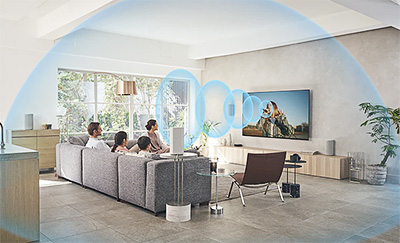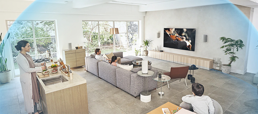 La zone d’écoute étendue remplit tout votre espace de vie. Ainsi, vous et vos proches profitez de la même expérience audio. La zone d’écoute ne se limite pas à l’avant du téléviseur, mais englobe un espace beaucoup plus vaste.